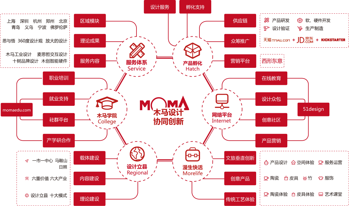 Moma in the past few years projects continue to actively explore, puts forward a set of their own unique cultural and creative theory of product design and development: through the design practice of commercial thinking, aesthetic experience and technical breakthrough as one plus the vertical to create innovative thinking, creative design the field of closed-loop, establish a perfect creative ecological circulation system. In view of the different attributes and characteristics of these four fields, we give different innovative strategies. To culture, product development, space construction, service operations as the core, with the concept of service as the lead, to build a complete innovation system.
