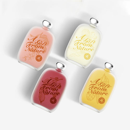 整体包装设计,以果酒所对应的水果插画,为背景,表达果酒原料取之于自然,新鲜健康。整体为轻奢暗纹,花体英文古典优雅。艺术性较强的英文花体为视觉焦点,突出品牌slogan-大自然的礼物。品牌logo及简要产品信息,更易于让消费者快速了解产品。