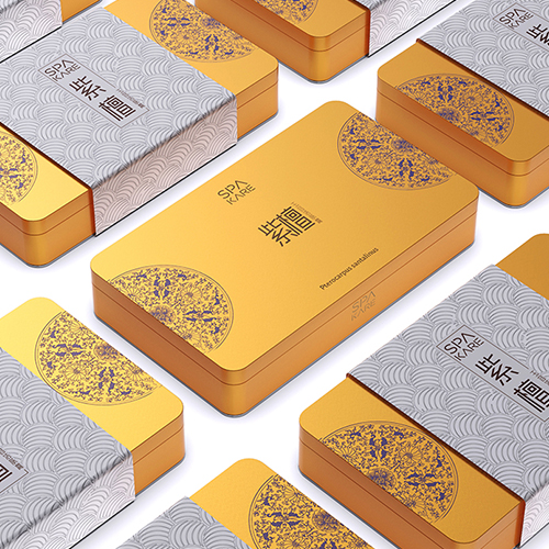 盒体布局灵感来源古代龙袍两肩处圆形纹样,圆形象征圆满完美。盒体与盒体相接两侧紫檀花纹样会组成完满的圆形。紫金配色透露着品牌低调与奢华,白银的传统水纹腰封强化品牌调性。
