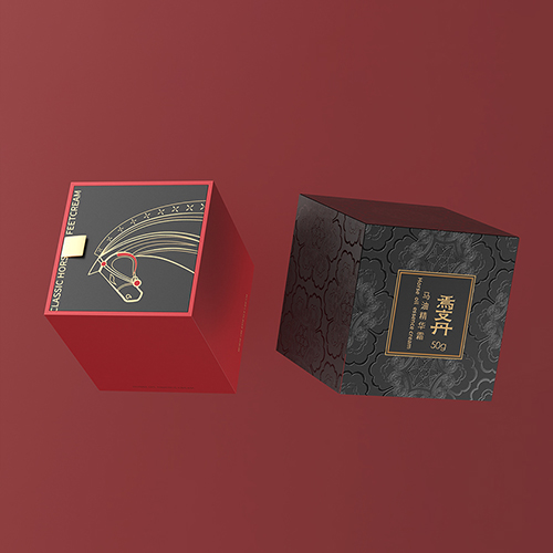 本方案增加两种不同面霜瓶与包装设计。左边采用硬卡天地盖形式,瓶身采用红黑渐变,连接黑色瓶盖,瓶盖采用宝相花纹刻印,增加细节与层次感。天地盖硬卡盒版设计增加马头烫金垫板,呼应品牌“马油”印象。采用漆器红黑配色,打造汉唐视觉效果,体现低调奢华的贵族气质。