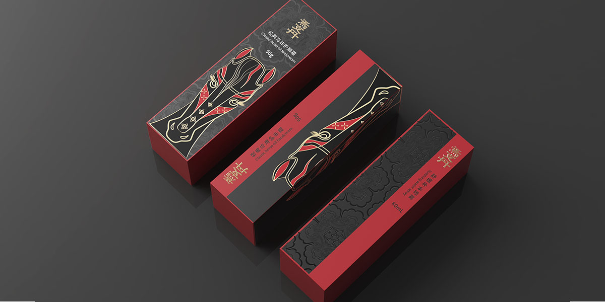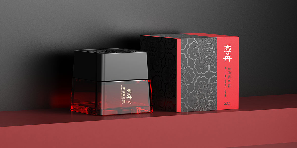 本方案增加两种不同面霜瓶与包装设计。左边采用硬卡天地盖形式,瓶身采用红黑渐变,连接黑色瓶盖,瓶盖采用宝相花纹刻印,增加细节与层次感。天地盖硬卡盒版设计增加马头烫金垫板,呼应品牌“马油”印象。采用漆器红黑配色,打造汉唐视觉效果,体现低调奢华的贵族气质。