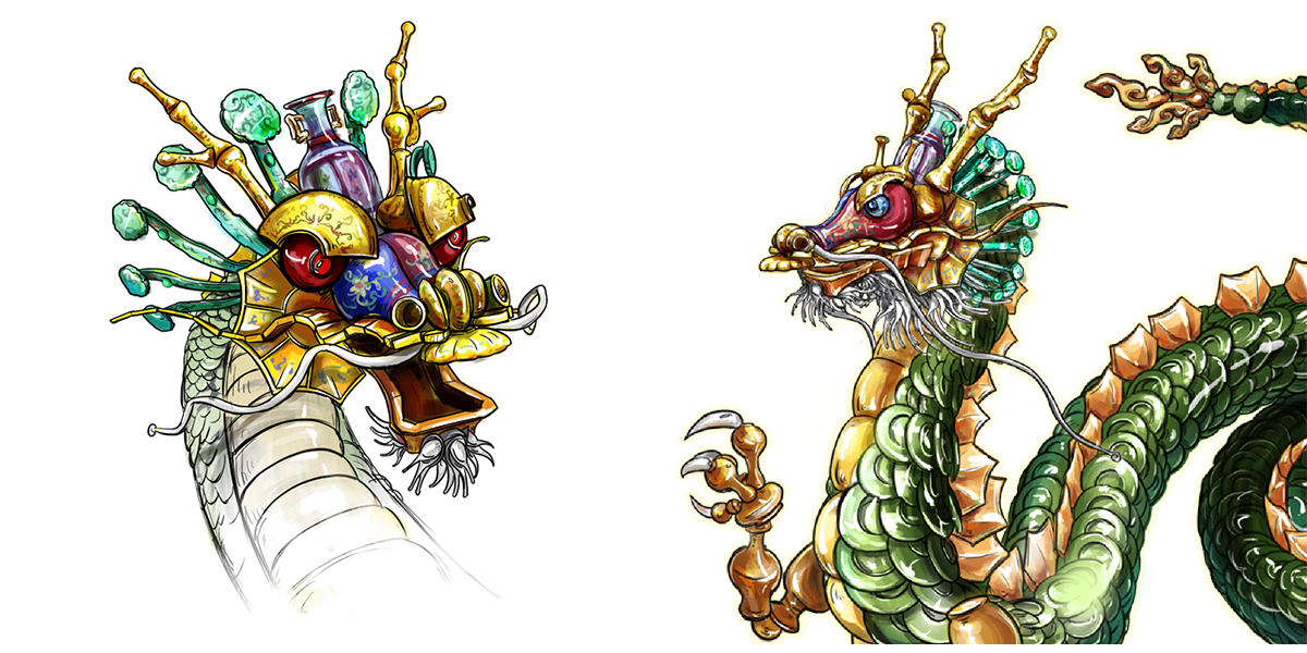 LONG的居所是龙珠阁,威严大气的宫殿象征着他的皇家气派。瓷龙不是很合群,总是很严肃。LONG执掌御窑之石,是清代御窑瓷的代表,此石被藏在他的嘴里。