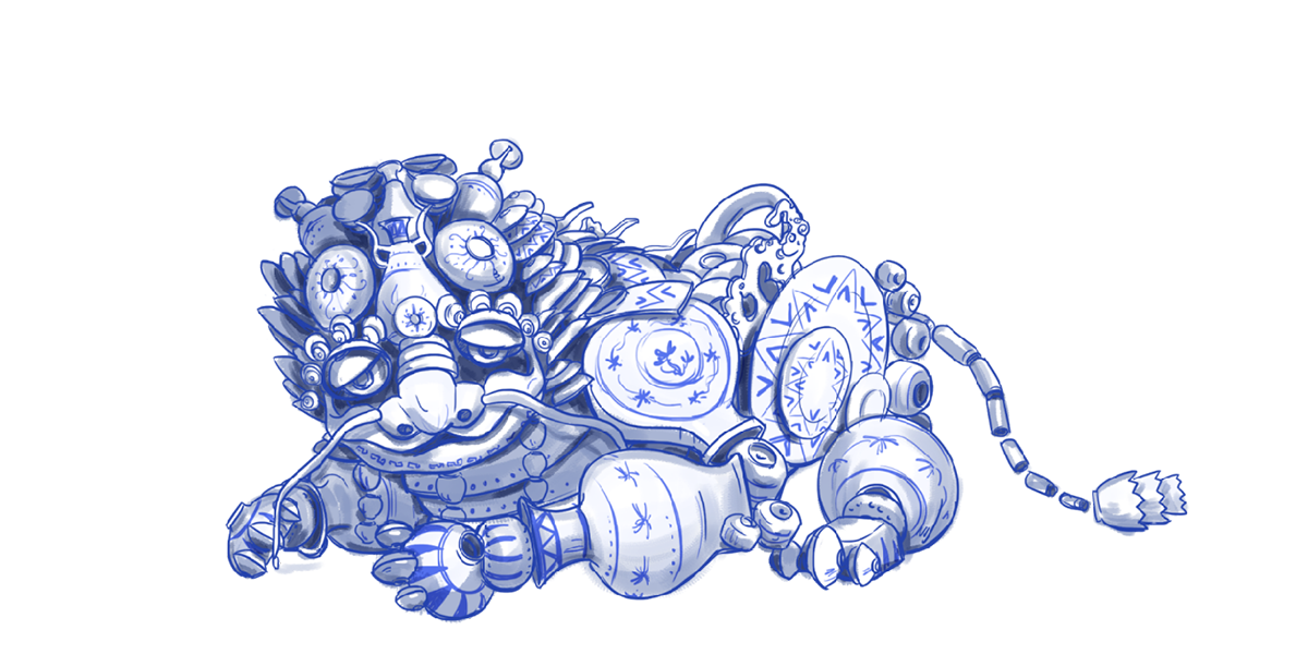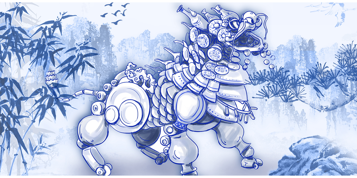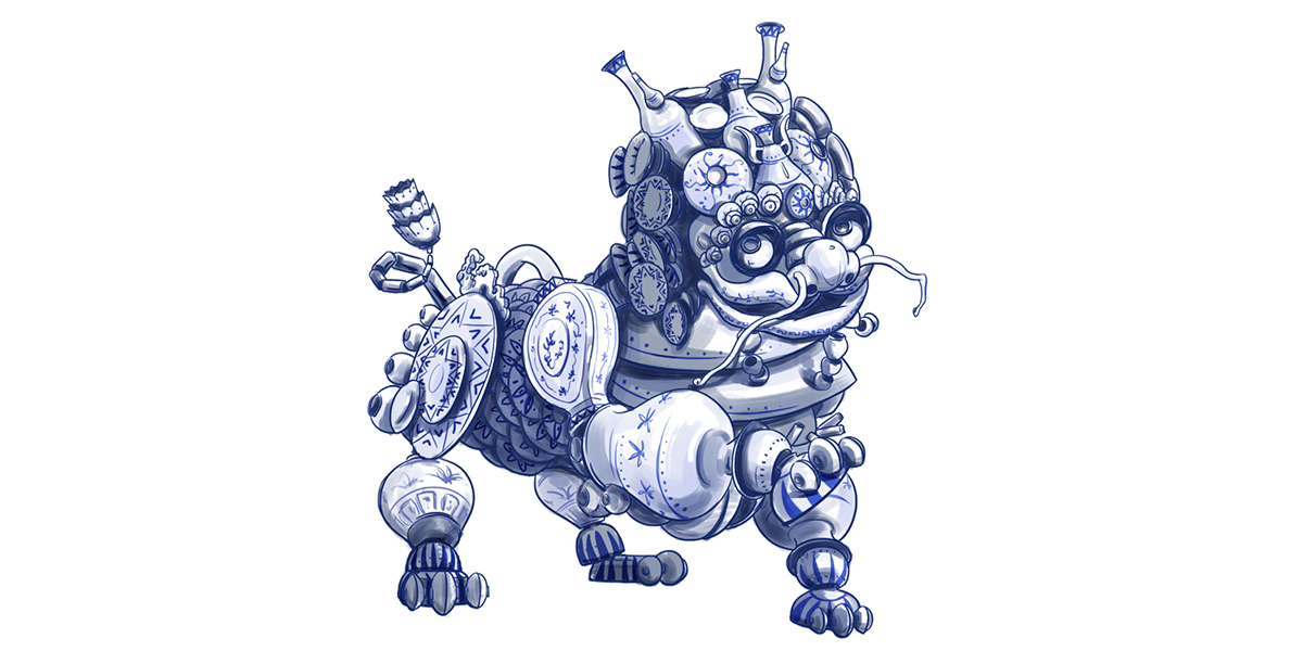 传说中,在瓷世界里,一切生机盎然,在生态圈的顶端,有一个精灵和五个瓷瑞兽,瑞兽们守护在一条“瓷河”沿岸。HUA是一只由著名青花瓷构成的瓷世界瑞兽。他活力、动感、单纯、自信、一身正气。