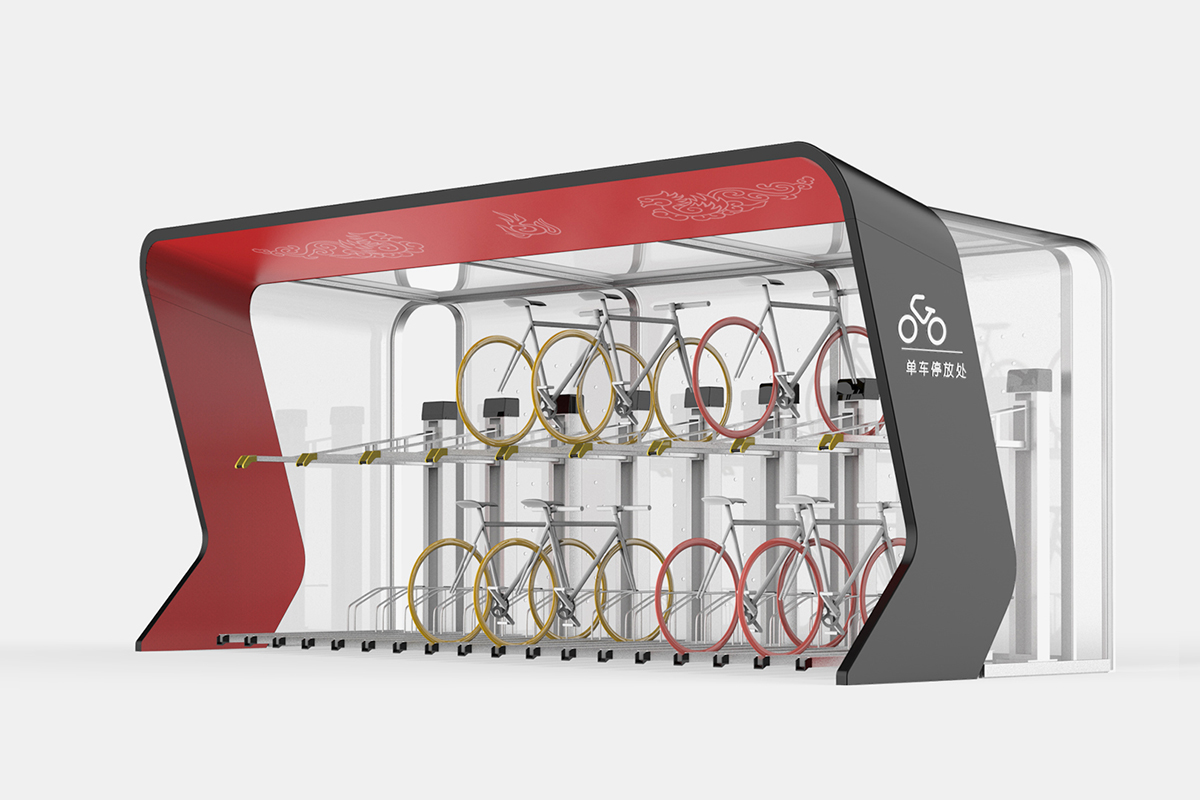 采用上下两层的停放方案,有效利用有效空间,使得单车停放更加饱和,内部大空间也可提供临时躲避恶劣天气的空间条件。