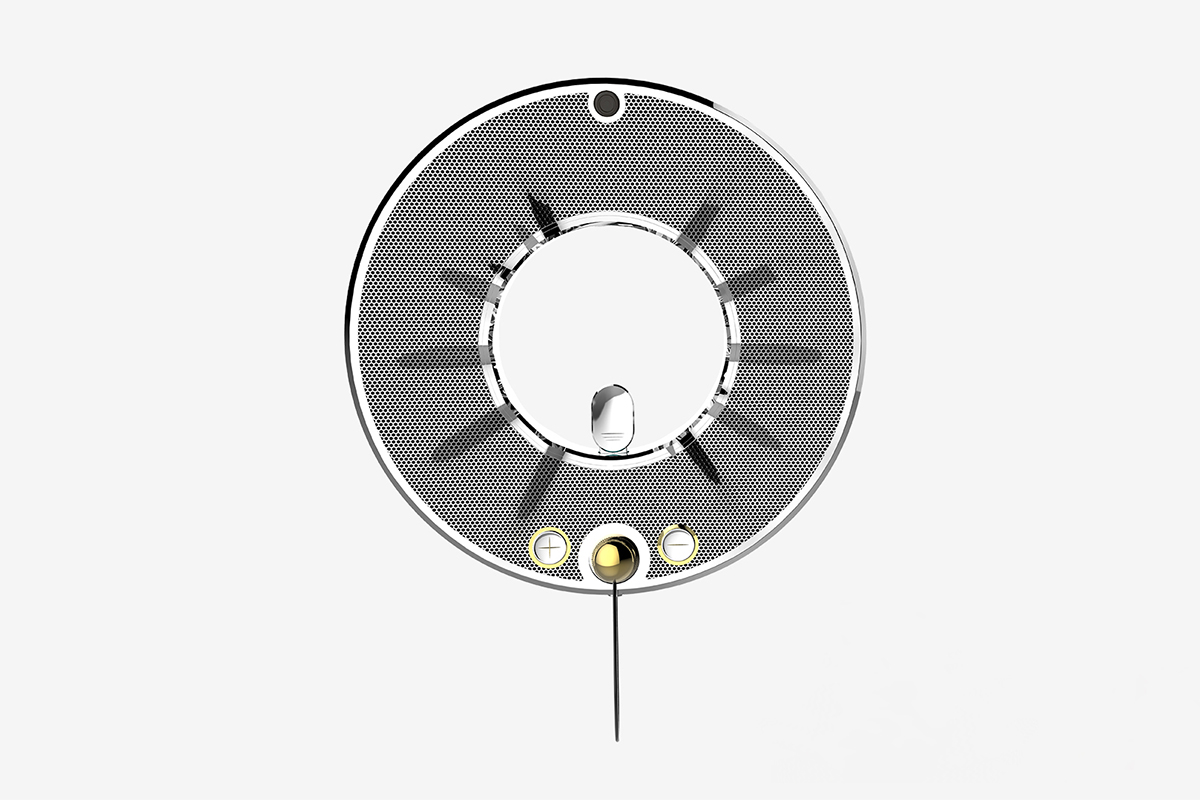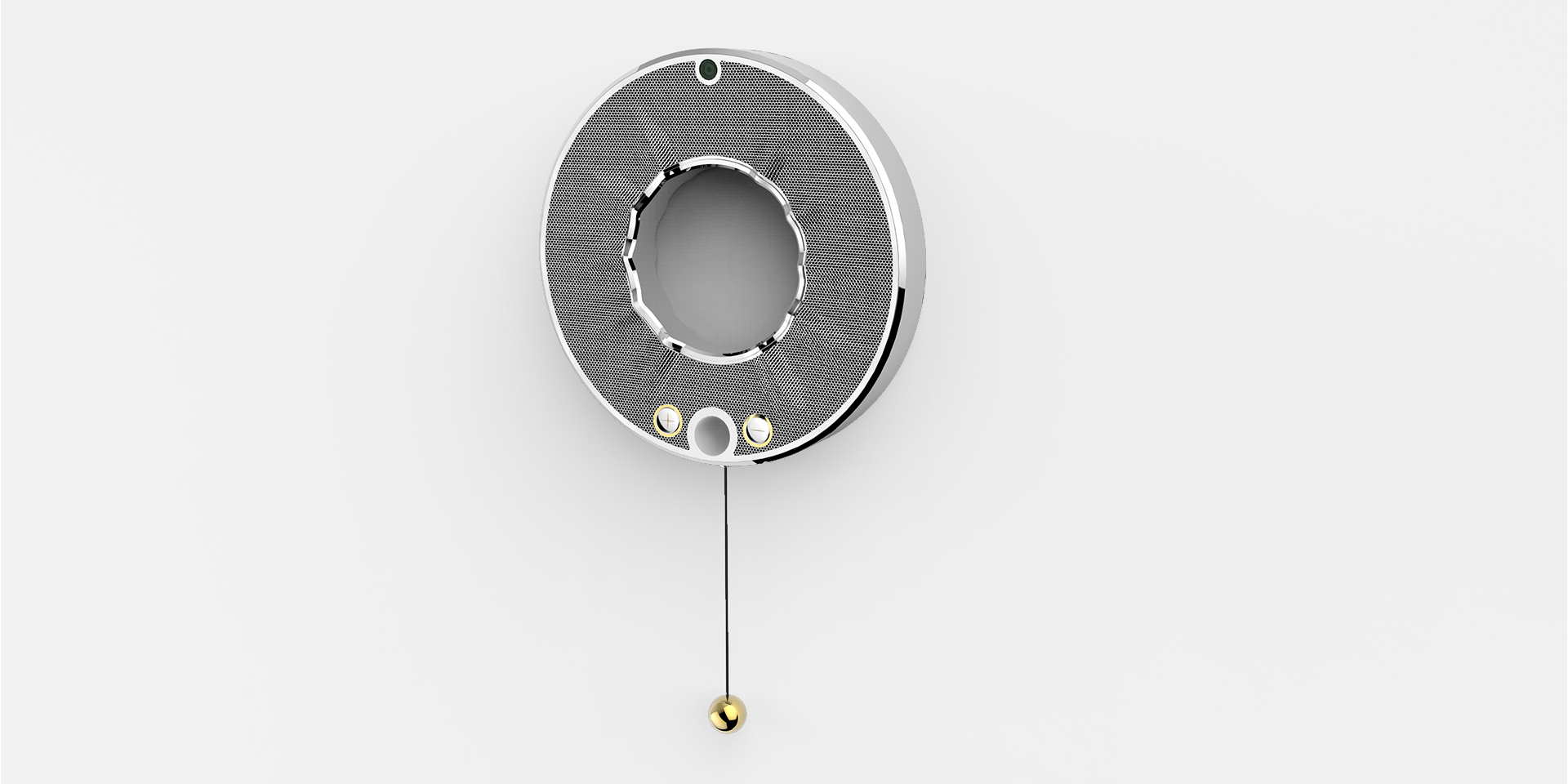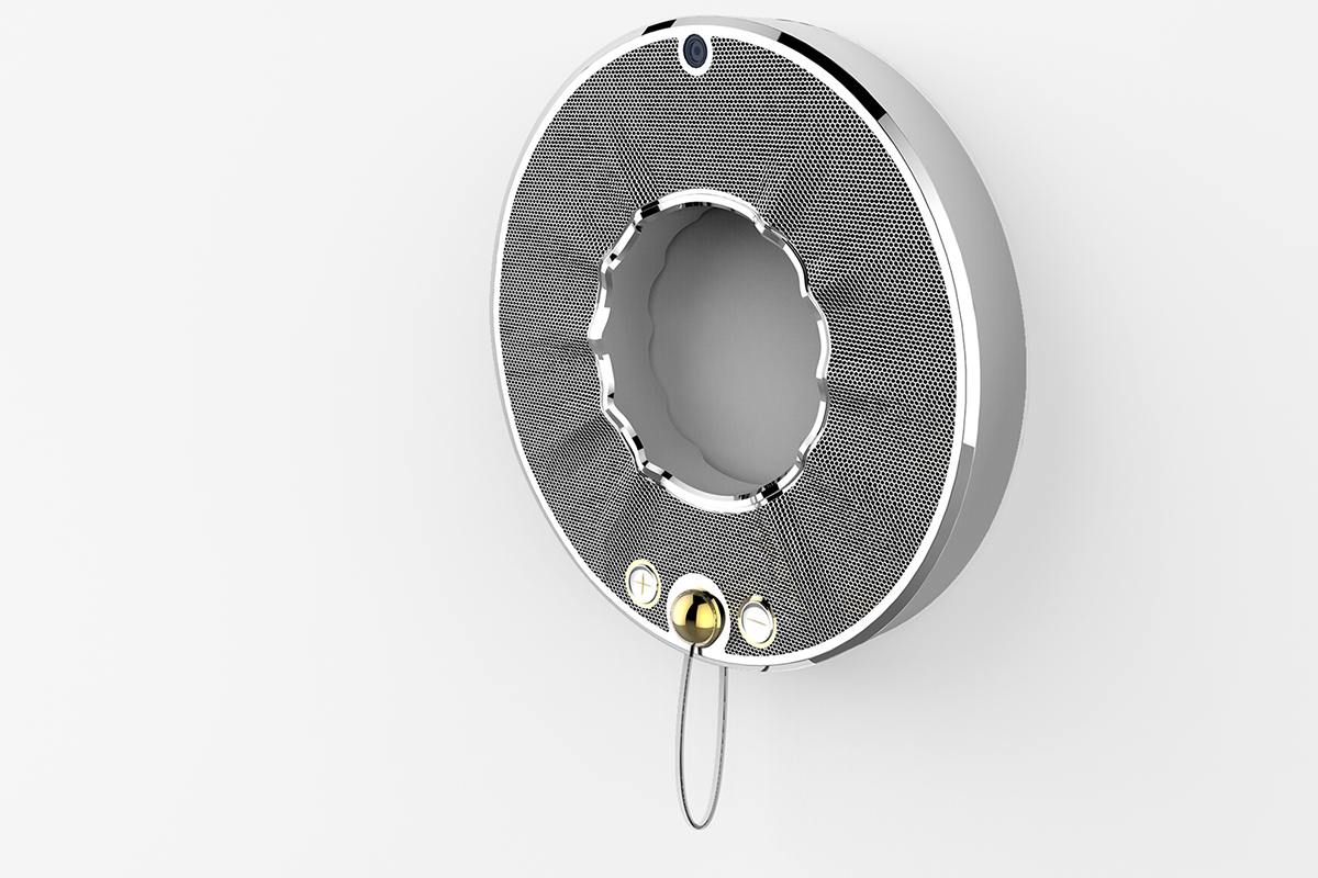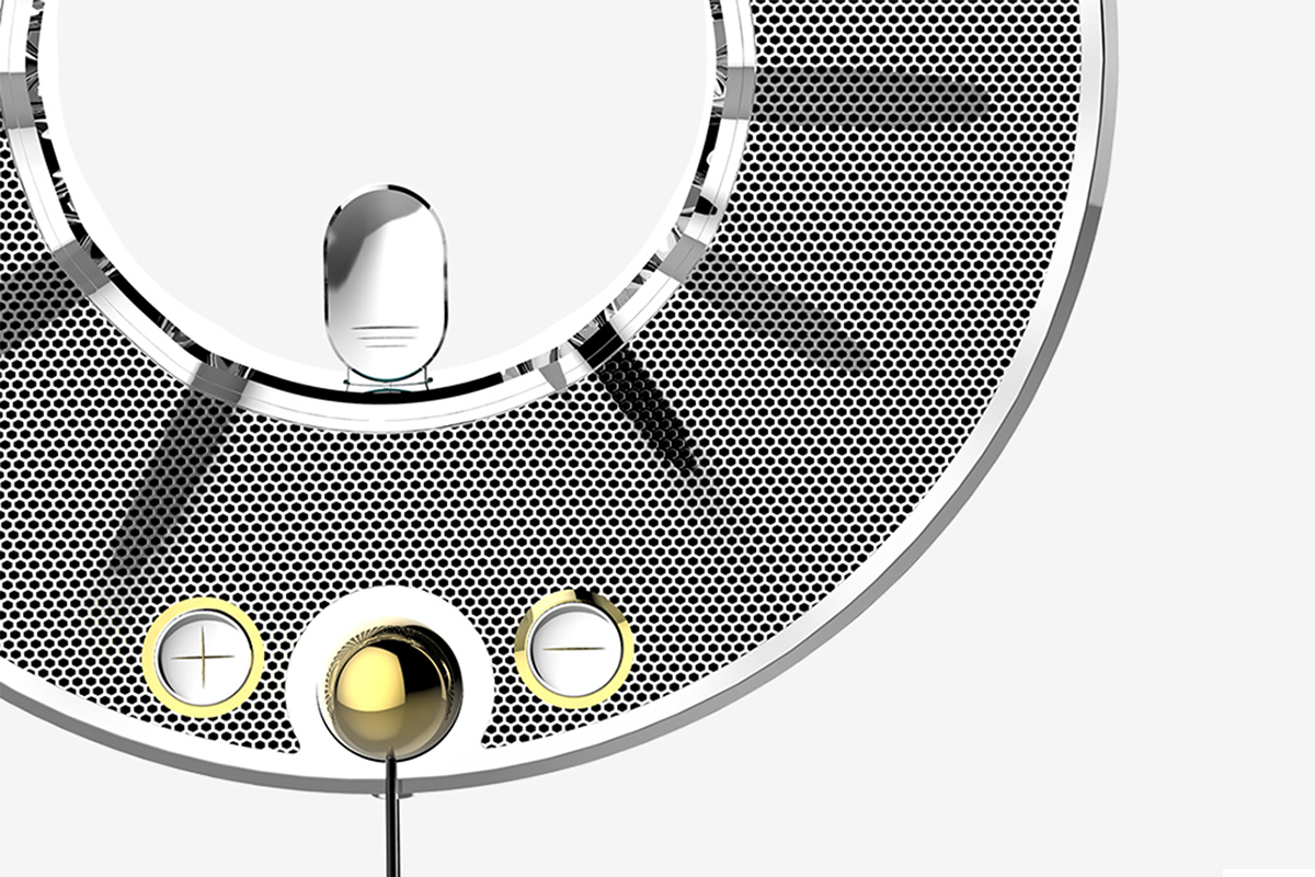 该音箱的整体外形灵感来源于古希腊的太阳之神赫利俄斯,寓意着这款音箱像拥有太阳之神的能量一样,守卫着家庭的欢乐与快乐。采用壁挂式的独特设计在节省家居空间的同时又能满足装饰需求。开关是下方垂摆的小球,开启方式新颖,创造出一种别样交互方式,令人耳目一新。