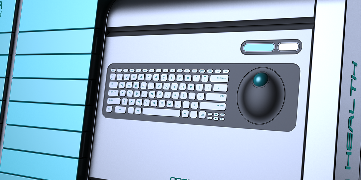 产品设计风格简约、现代,通过几何形体的穿插,划分出储藏区域和控制区域。右侧的控制区域键盘台面可以翻开,形成一个可以供医生写字的台板,既人性化又不影响产品造型的整体美感。
