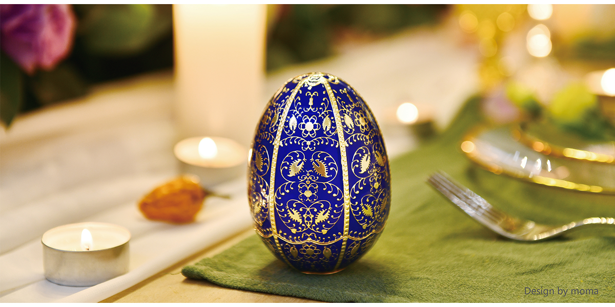《马约里卡金喜彩蛋套装》的设计源自大英博物馆藏品一文艺复兴时期马约里卡陶盘,将文艺复兴缔造者美第奇家族的族徽作为整个设计的设计重点,形成统一的设计语言,将所有产品融为整体。