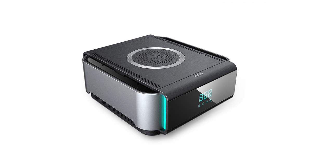 设计师通过简约的设计语言,运用不同的表面处理工艺提升了产品的价值感,激发潜在用户的购买行为。产品内部集成负离子检测器,实时监测 PM2.5、湿度等相关空气指数,周围的提示灯会随空气质量的改变而发生变化,通过产品前方屏幕显示给用户,并且智能开启净化模式。