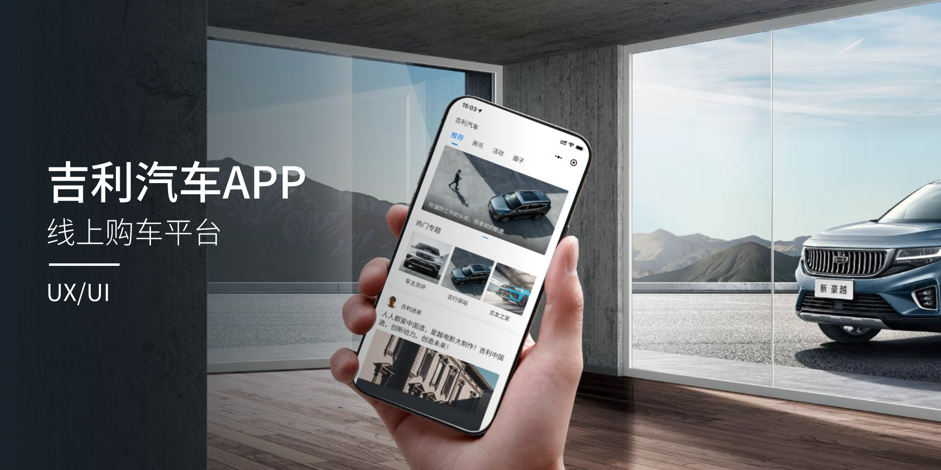 该设计基于吉利用户需求打造了一款一站式掌上服务平台,为用户提供了优质便捷的用车服务,开启智慧互联的用车新生活。