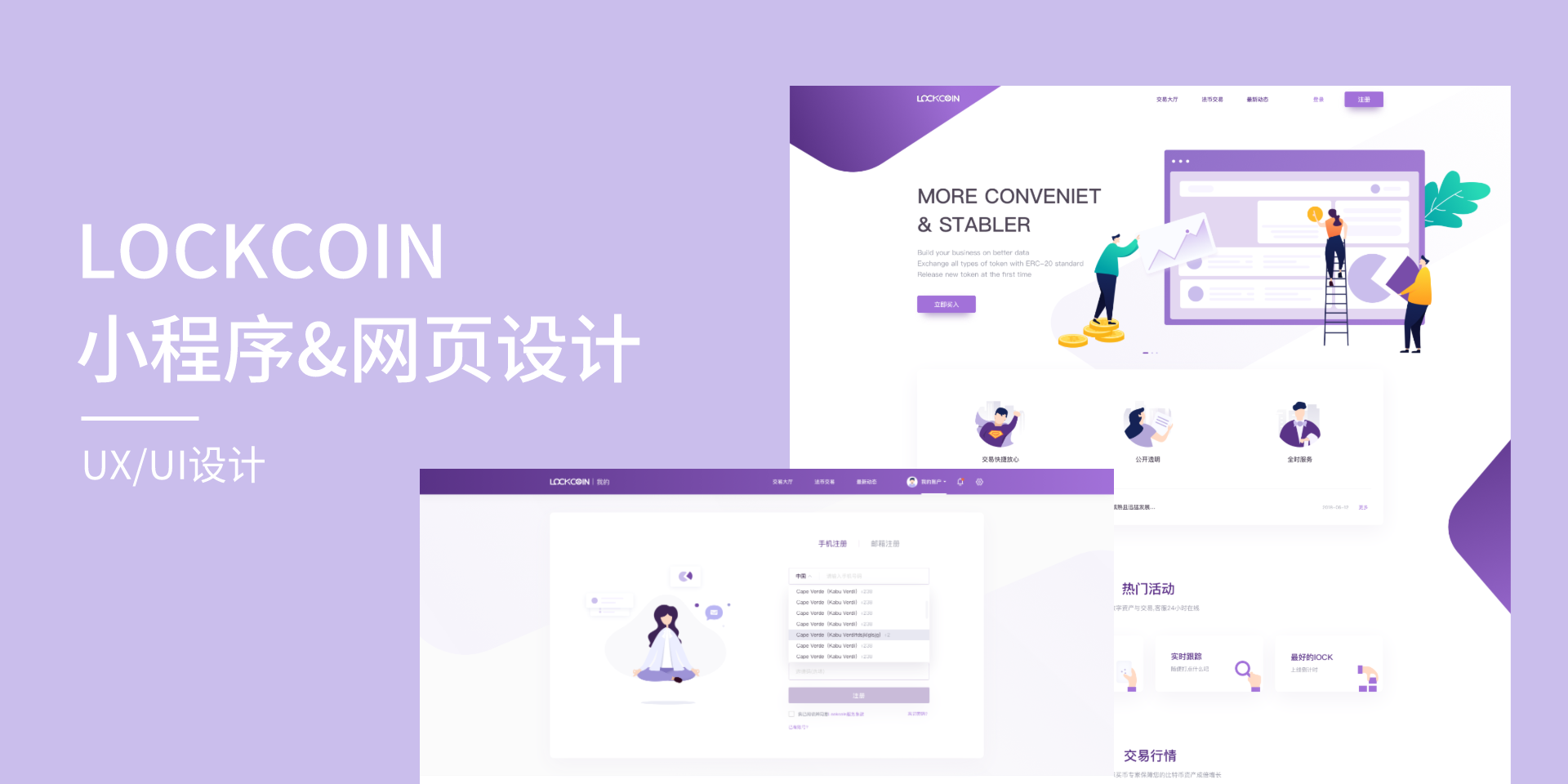 LOCKCOIN小程序及网页设计紧扣区块链产品目标用户对币交易灵活周转、钱包安全、掌握市场行情变化的心理诉求,通过对竞品的大量调查和分析,围绕定位、人群、功能等多种因素寻找符合产品调性的视觉设计方案。整体界面设计以紫色为主色调,以扁平插画与几何图表相结合的形式…