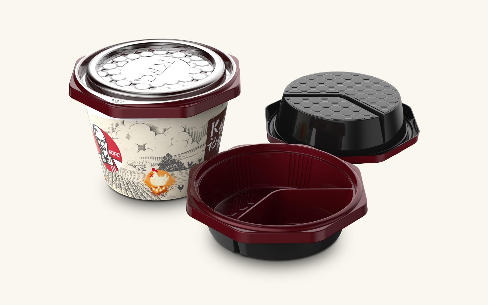 从结构角度来看,八边形非常稳固,整个饭盒不需要添加任何加强结构的部件,就可以实现原定的强度标准;从人机工学角度来看,此造型有增大摩擦的防滑功能,也更适合消费者的拿取动作,优化用户体验;从材质角度来看,设计师用竹纹、木纹作为主材质和色调基础,带有中式禅意的原木色能够体现出肯德基用心制作一碗米饭的认真与诚恳;桶身使用了绛红色,以此来代表肯德基原有的品牌色,深褐色的内壁则利用色差带来的对比感,突出菜肴的可口色泽,引起消费者的食欲并带来感官上的多重享受。