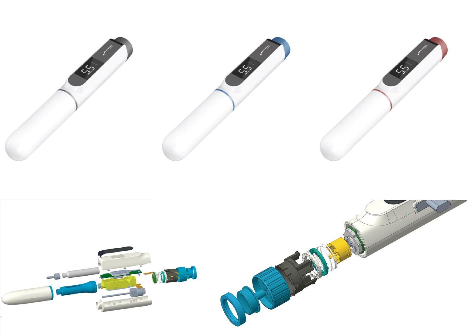 产品适用于各类3ML卡式瓶药剂的自动注射,通过步进电机和软件算法,实现0.01ML的精准控制。在接近传统机械式注射笔的体积内整合了OLED显示屏、聚合物电池、控制电路、蓝牙传输等功能。工程师通过创新的结构方式,使产品延续了传统机械式注射笔的操作逻辑,降低了用户使用本产品的学习成本。