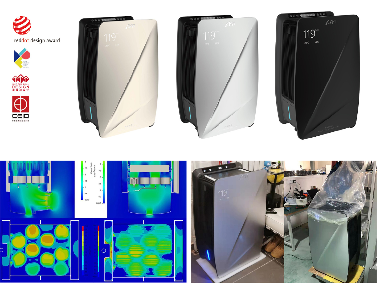 本新风机采用无耗材技术,通过自清洗使过滤核心可以反复利用,降低使用成本同时对环境更加友好。由于内部空间小、零件数量多,且存在漏水短路的风险,结构设计难度极大。设计过程中,工程师应用CAE流体分析,评估和比较不同的风道结构,找出最优解,提高了产品的净化效率,并将噪音水平降至最低。产品凭借创新的设计和优异的性能获得了包括红点奖在内的多个国际国内设计大奖。