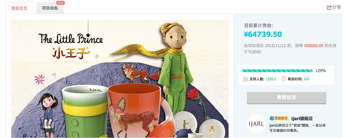 在小王子电影上映之际,木马设计与天猫商家合作,推出小王子正版电影周边产品。产品在淘宝众筹平台首次亮相,便受到消费者热烈欢迎。此次合作是木马继梵高系列艺术衍生品之后在文化衍生品领域的又一成功尝试,由木马、淘宝平台、天猫商家的协同合作创建了优秀健康的商业模式,保证了闭环的、顺畅的资源流通,成功将电影IP转化为可交易的创意资本,实现其商业价值。