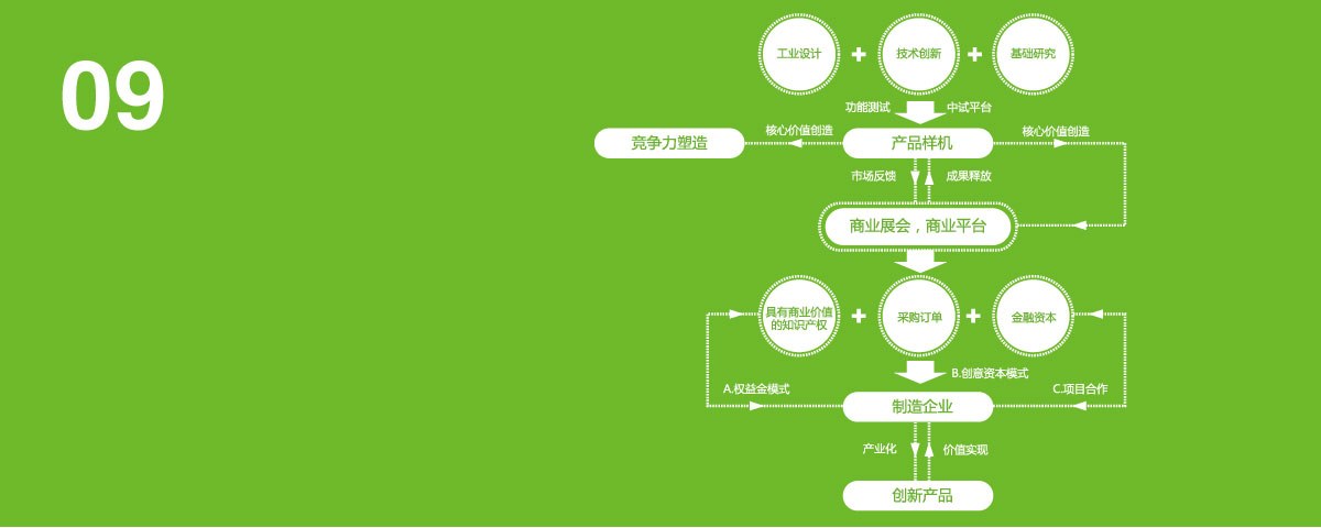 创意资本模式是创意设计价值实现的高级阶段,将创意的力量作为一种资本形式驱动制造企业 的发展。从概念设计到产品样机再到具有知识产权的创意资本,创意的价值得以真正实现。 基于特色产业,建立区域工业设计研究院,不断释放效果。从概念设计,到产品样机,再到具有知识产权的成果,帮助企业实现从制造力驱动到创新力驱动的转变。搭建知识产权展示和交易平台,更好的把产业需求和创意资源对接。建立知识产权保护平台,保障创意资本模式的正常运行。