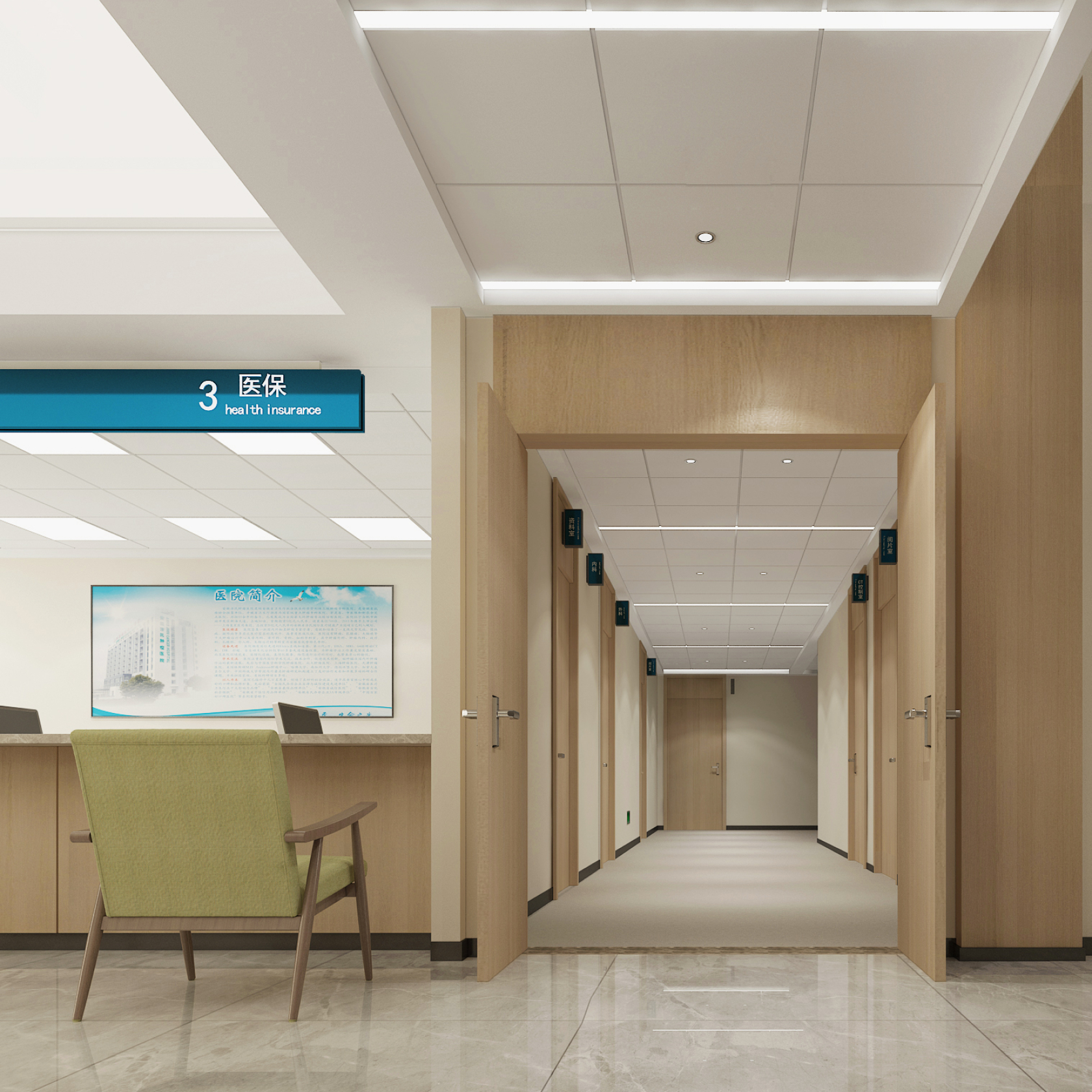 医院作为一个不同于其他公共建筑的特殊场所,其空间环境很容易让人生成一种天生的恐惧感,因此我们需要借助良好的室内环境和氛围的营造提升医院整体形象,拉近与患者之间的距离感。 因此在设计上我们大量使用原木色等暖色调来弱化患者的紧张、恐惧心理。并在门诊大厅、缴…