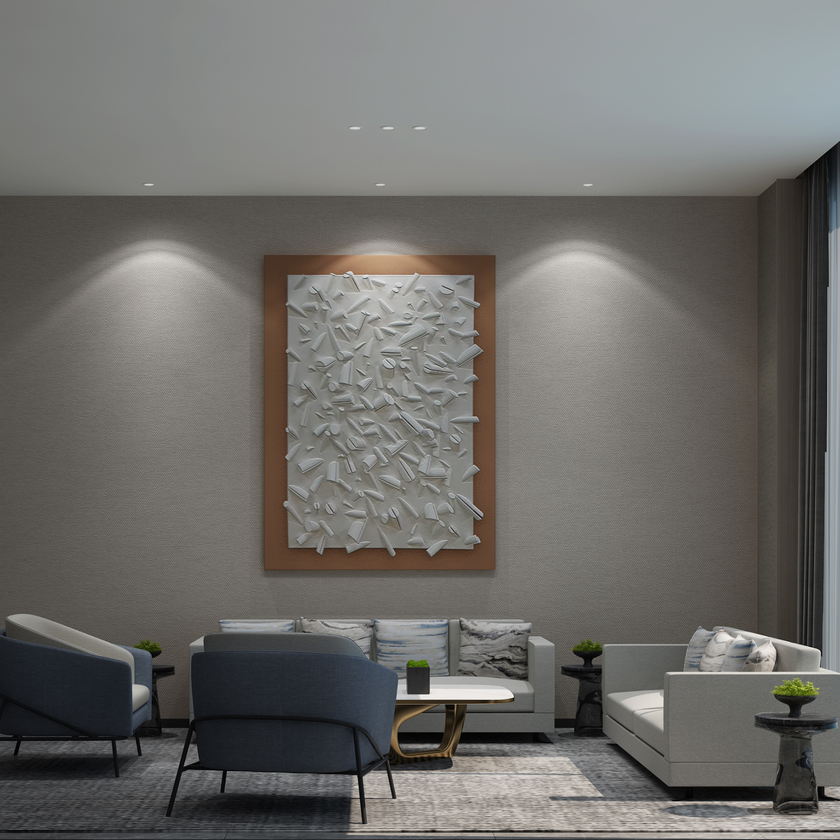 设计师以现代前卫的设计手法让酒店空间开阔、干净、有序,而几何线条的顶灯和对称设计的射灯让整体空间多出自由、活泼的感觉,版画、切片装饰画、艺术摆件和绿植很好的弱化了现代风冷硬的氛围,打造出有活力的室内空间。