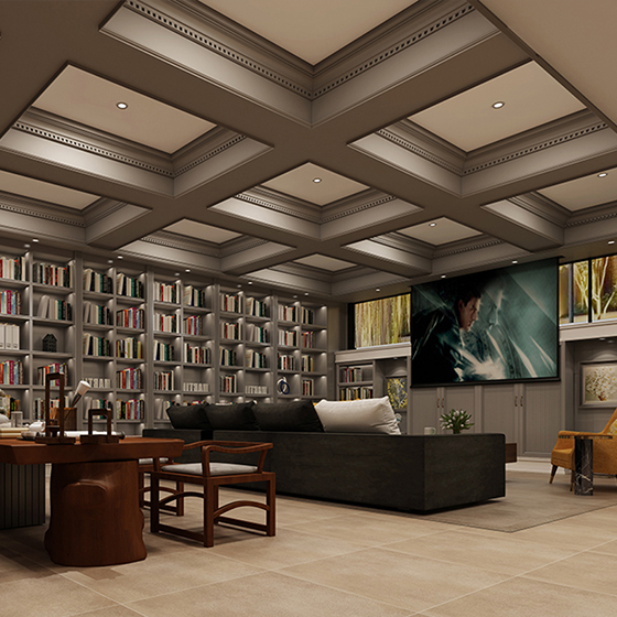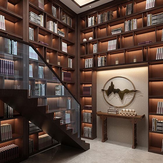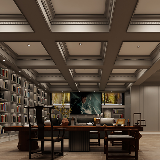 本案设计以新中式为主要风格,在书房、客厅大量采用格栅设计,在餐厅上设计圆形装饰画,寓意天圆地方,在书房背面还设计了一整面博古架,传承了中式古典设计理念,在整体颜色上浅色地砖加原木色的墙面装饰,视觉效果极为舒适,营造出的空间效果极具高级感。