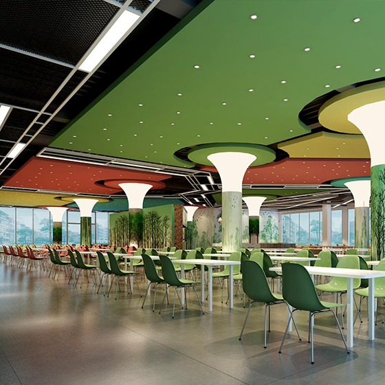 本案为突破传统食堂就餐空间单调、乏味、无趣的现状,在设计上大胆使用多种色彩,通过色彩体现大学生青春活力的精神面貌,并通过丰富的空间功能来迎合现代大学生餐饮文化的多样化需求,区域的隔断形态和细节的处理也进一步强化了设计的独特性。