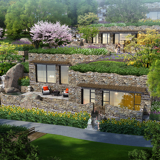 运用和谐自然设计理念,大量采用石材作为建筑主材,设计以山水自然为主线,景观绕水而生,房屋组合布局,水的柔美与石的阳刚形成强烈反差,现代建筑与自然山水有机结合,演绎出山水一体的绝美意象。
