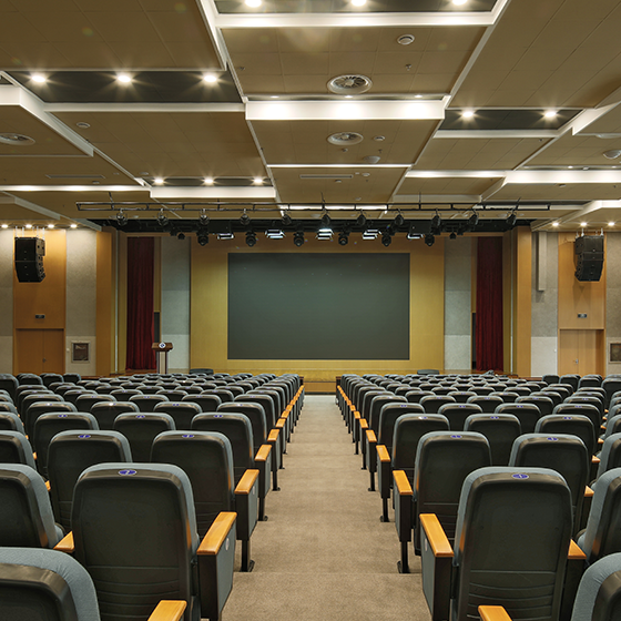 学术报告厅以实用、庄重、大气为主要设计理念,并根据原有建筑机构采用阶梯式设计方案,在顶面装饰预留出足够高度,并通过筒灯的分布人为将顶部分为若干部分实现区域局部照明,并充分考虑采光、隔音等诉求,在功能上满足学术报告、表彰会议、多媒体教学等多方面需求。