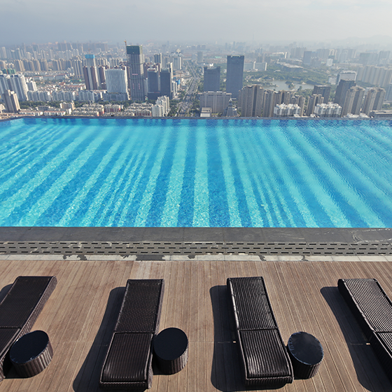 本案坐落于日照最高楼安泰国际广场楼顶,通过对游泳池边缘的特殊设计,让游泳池可以达到看似没有边的视觉效果,从而人们可以感到在空间上无限的视觉体验,建筑与自然完美结合,目光所及,碧蓝的池水与远处的蓝天碧海融为一体,视觉效果十分惊艳。