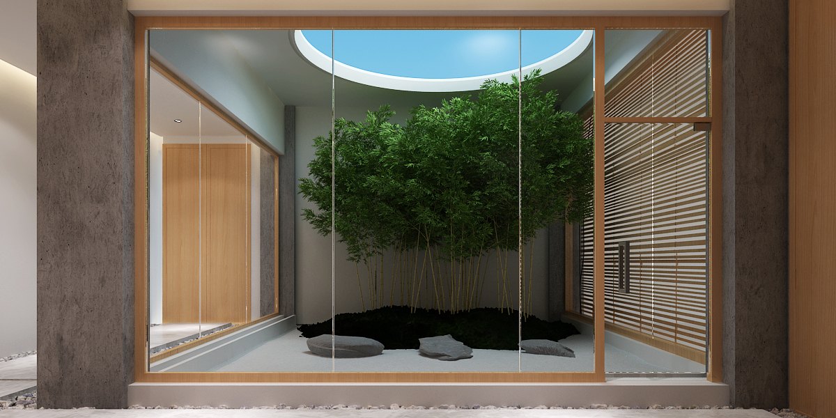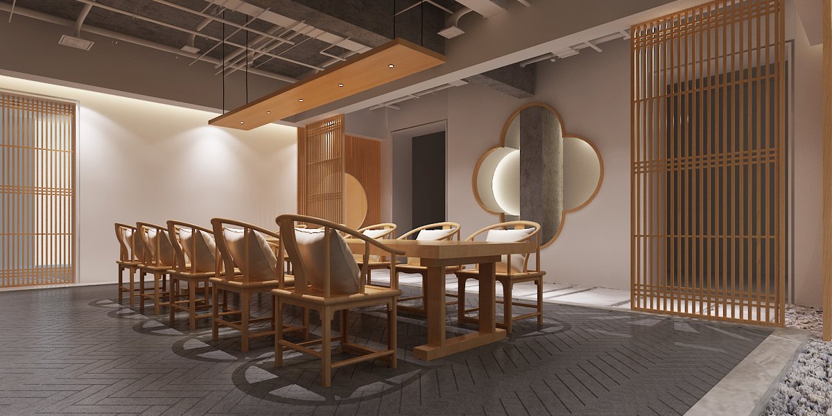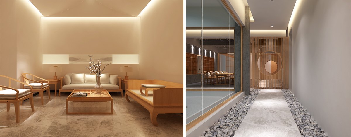 以禅茶贯穿整个会所装修设计空间,通过儒、佛、道家对茶的不同领悟来确定空间的主调。利用枯山水、竹、鹅卵石、圆景、框景的设计元素,融入现代主义,透过材质的形式变化,突出空间宁静超脱、通透别致的氛围,还原消费者所追求向往的世界。