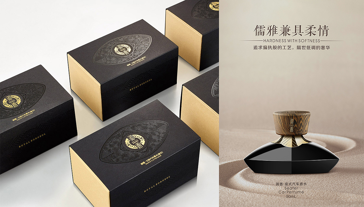 此次,汽车香水包装设计儒雅兼具柔情,从瓶型的设计到包装盒的元素设计都运用龙脑叶子的造型为基础,融入了神秘的东方文化图腾——祥云、叶子,水源等自然生态艺术,展现对大自然元素最崇高的致敬。