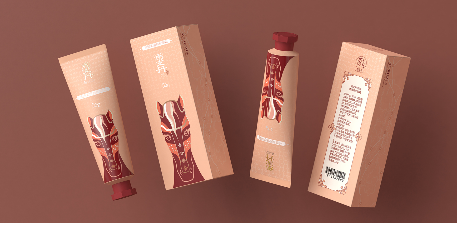 本方案中抓住产品主打成分“马油”的视觉载体“马”,将西北地理特征与历史图纹融入马头设计中,丰富产品内涵。