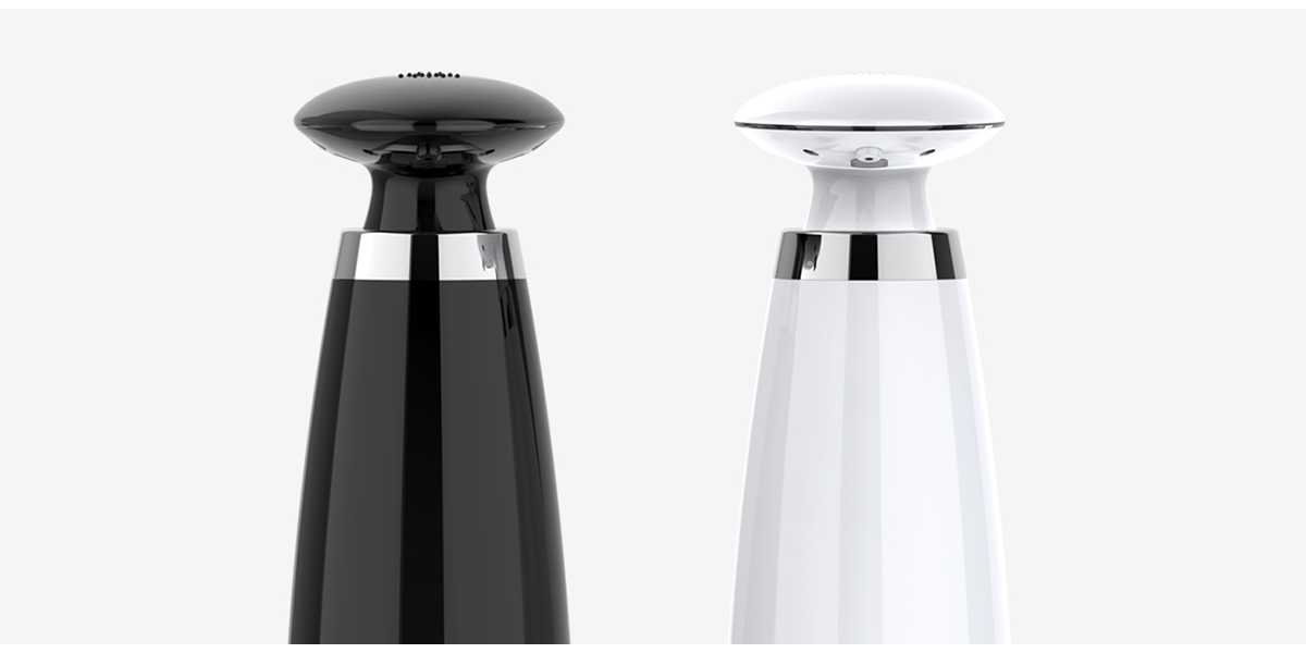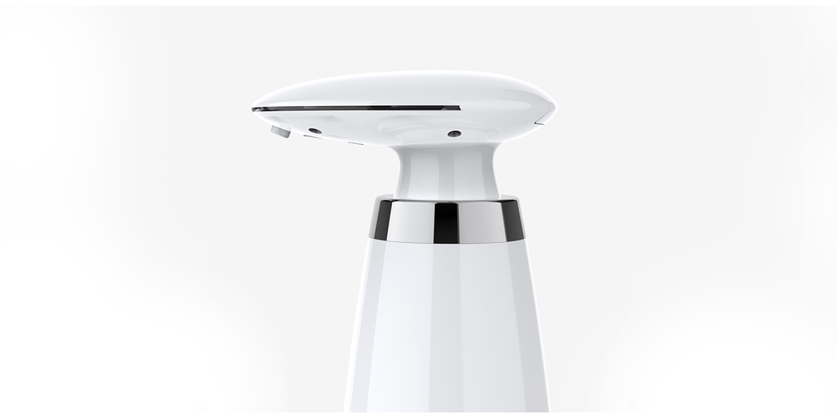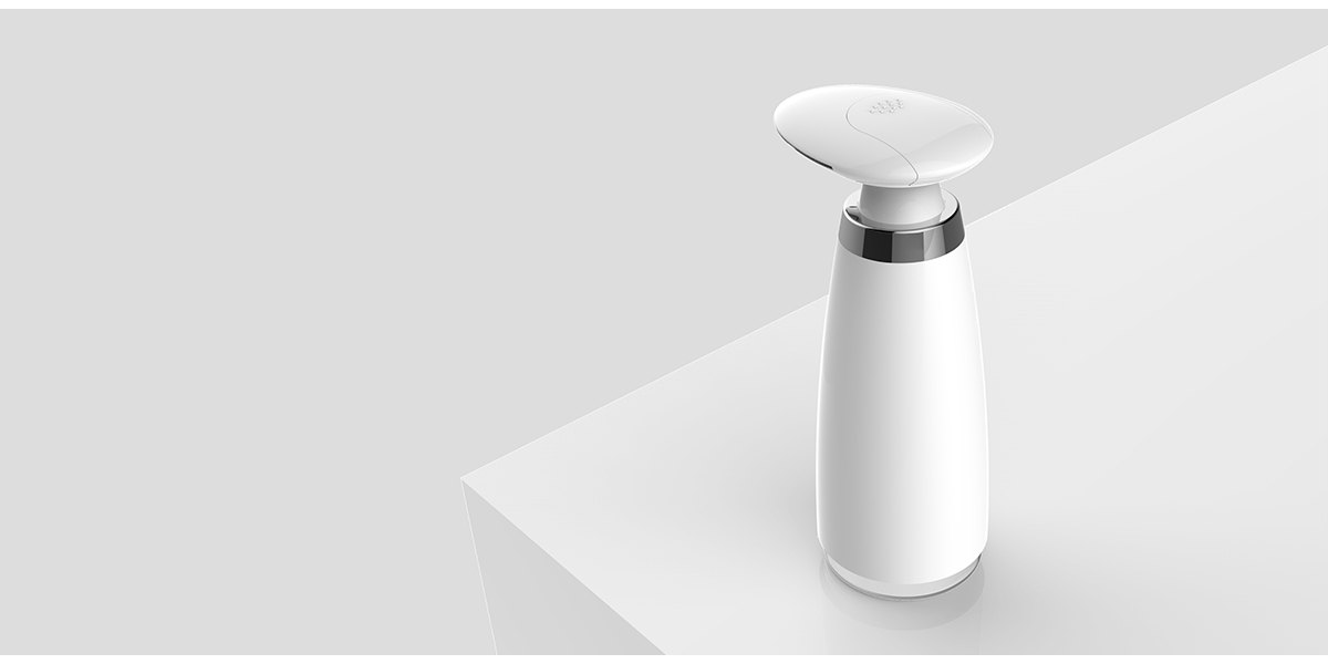 台面感应皂液器采用仿生的设计,将伞状“蘑菇”形态运用到产品中。产品运用了红外感应技术,由电机驱动喷头,自动喷出适量的洗手液到使用者的手心,既省去了使用者按压出液的动作,也避免多人碰触而带来的二次污染,同时出液量可以调节,有效地控制了用量,避免了浪费。