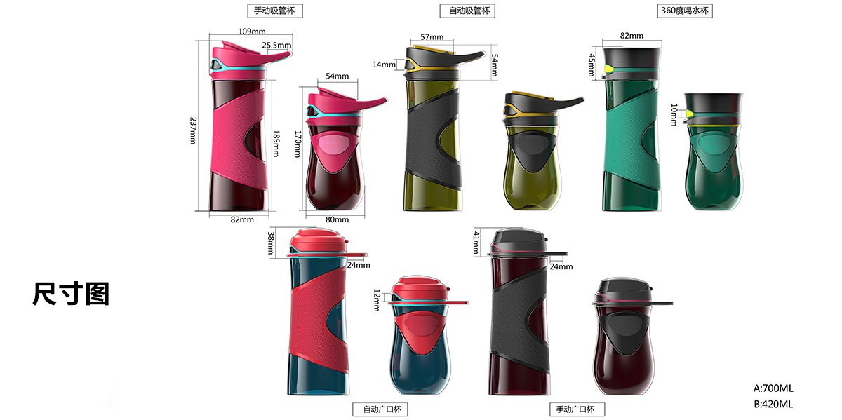 利时作为国内塑胶行业龙头企业,从用户体验出发,为水杯设计安全舒适的杯套。采用硅胶材质,起到防滑与隔热的效果,并且不容易脱落。配色上,运用时尚明快的色彩,使得随行杯整体简洁大方,适合不同人群在不同的场合使用,为多彩的生活增色。