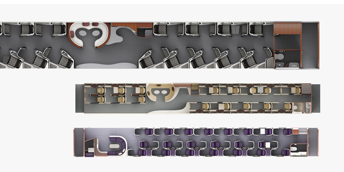 头等舱按乘坐区、用餐区、乘务员区、洗手间、行李区划分为 5 个区域,每个区域都相应配备了完整的全流程功能设施。设计过程中,团队以准确的功能性定位以及设计趋势分析,挖掘设计灵感,反复推敲产品外观和用户群体的关系,以最优质的设计作品呈现给客户和用户。