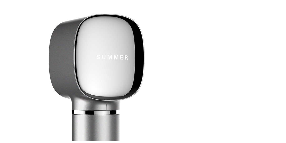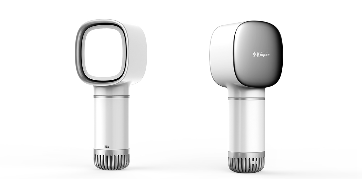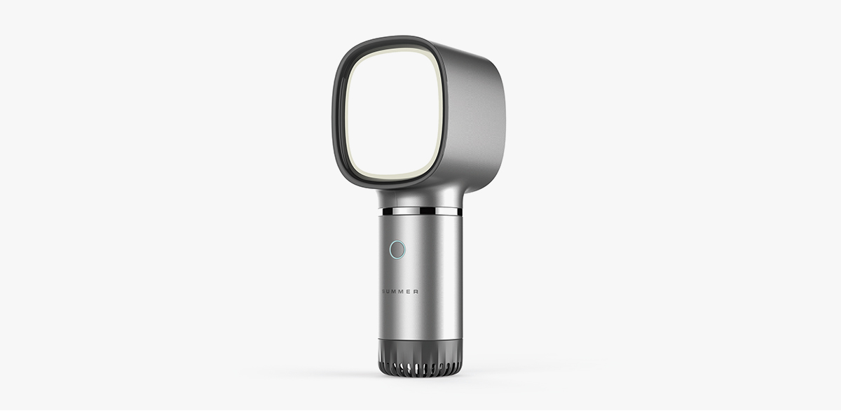 按键采用按压一键式,短按风量,长按补光,增加了光效功能。设计师将纹理与进风口相结合,隐藏式设计,减少进风口对整体造型的影响。