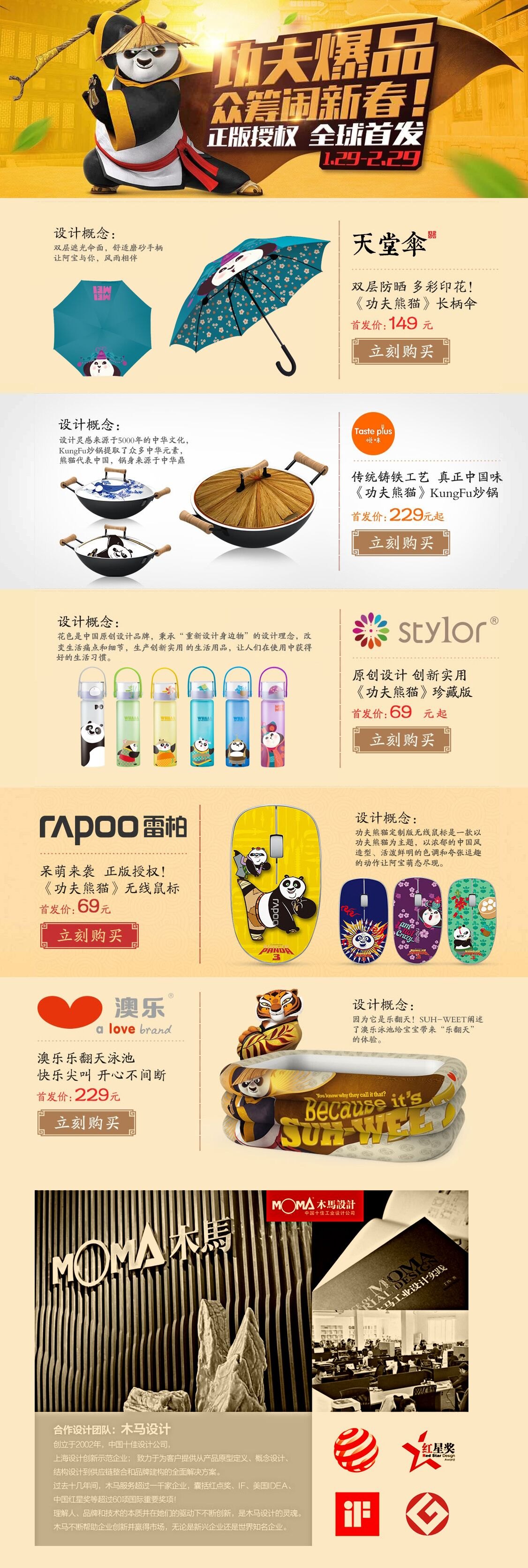 1月29日共上线20款木马设计作品,其中包括花色优品玻璃感温杯、悦味珍藏版Kung Fu32CM炒锅、雷柏功夫熊猫定制版无线鼠标、功夫熊猫系列儿童泳池、天堂伞之功夫熊猫折叠伞。创意产品件件精彩。