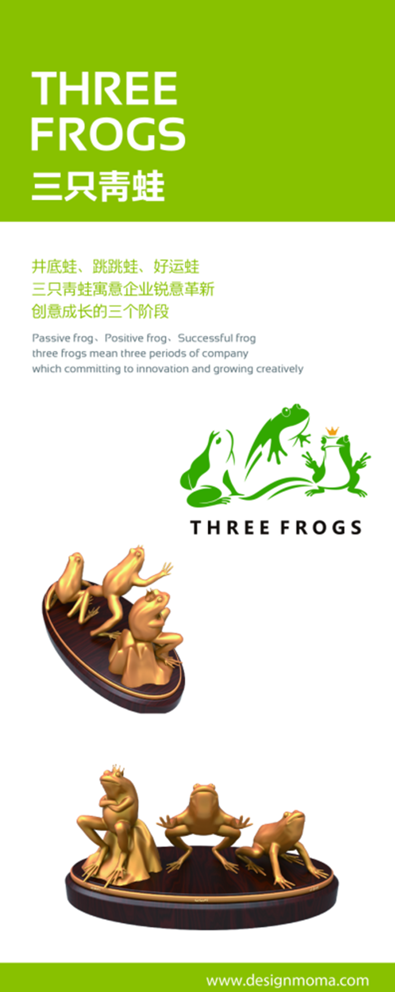 “井底蛙”、“跳跳蛙”、“好运蛙”三只青蛙寓意企业锐意革新创意成长的三个阶段。