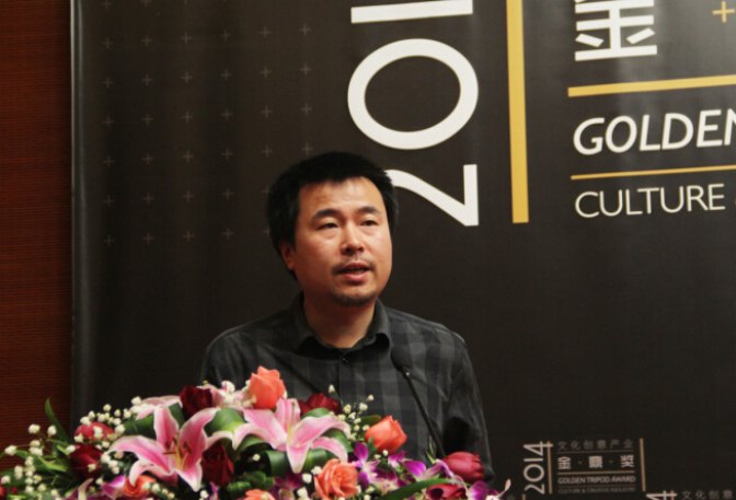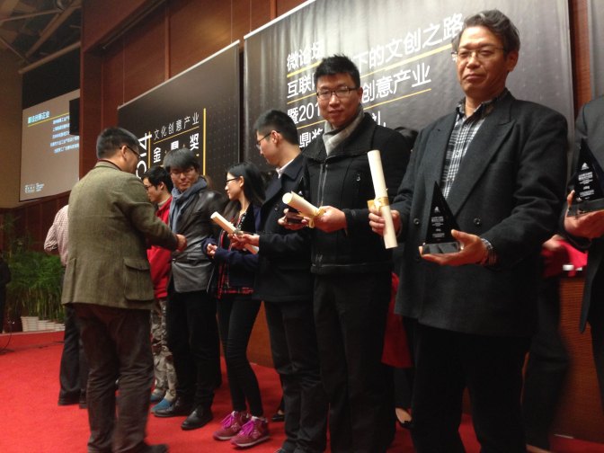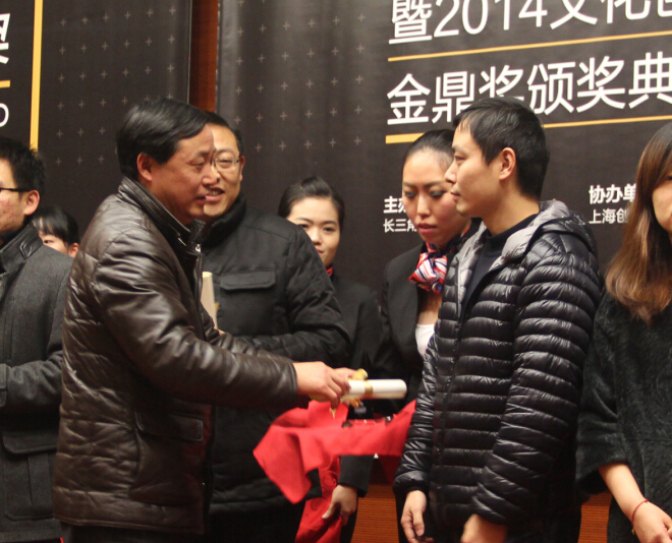木马设计总监许俊杰上台领取“2014文化产业金鼎奖最佳设计企业奖”。