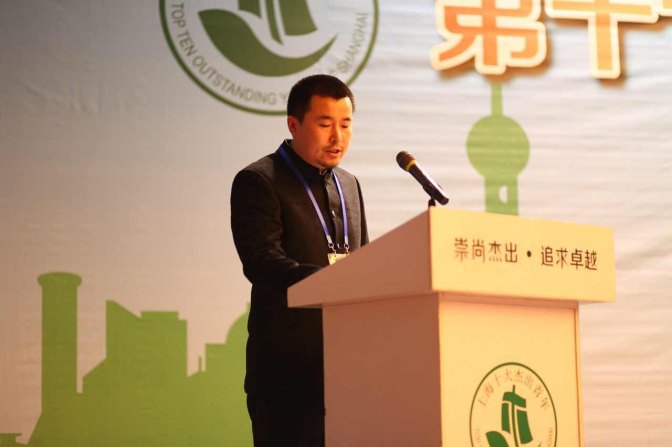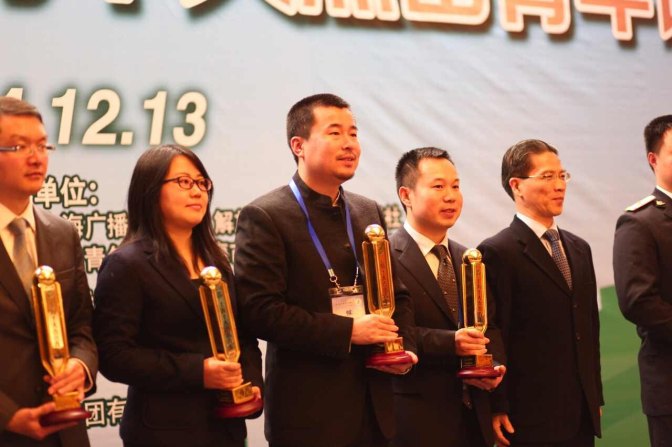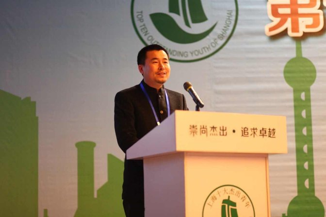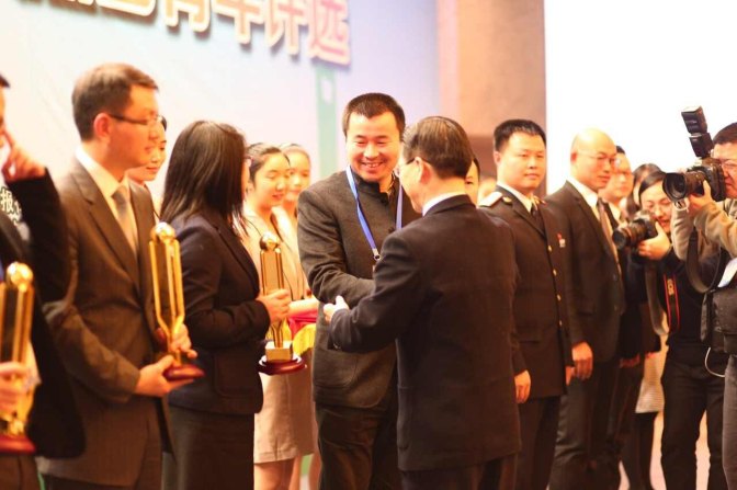 丁伟从全国政协常委、上海市政协副主席周汉民领导手中接过这意义深刻的奖杯