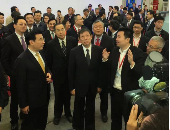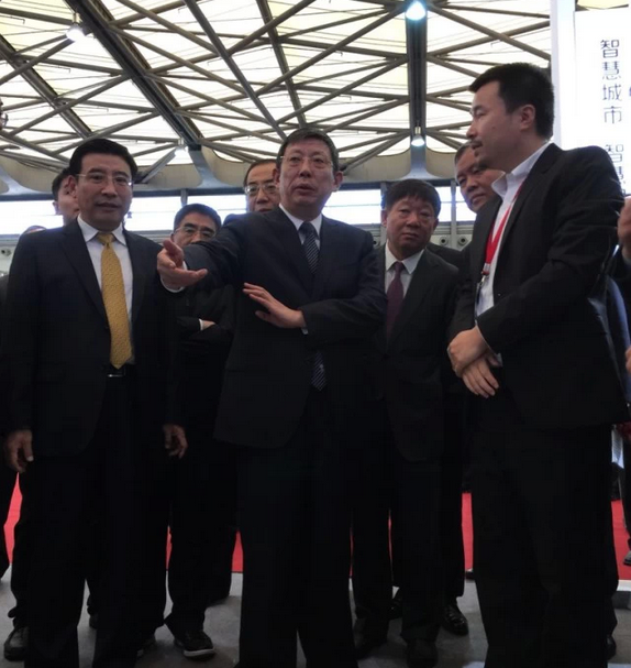 木马创始人丁伟向国家工业和信息化部部长苗圩、上海市市长杨雄汇报智慧照明推进工作。