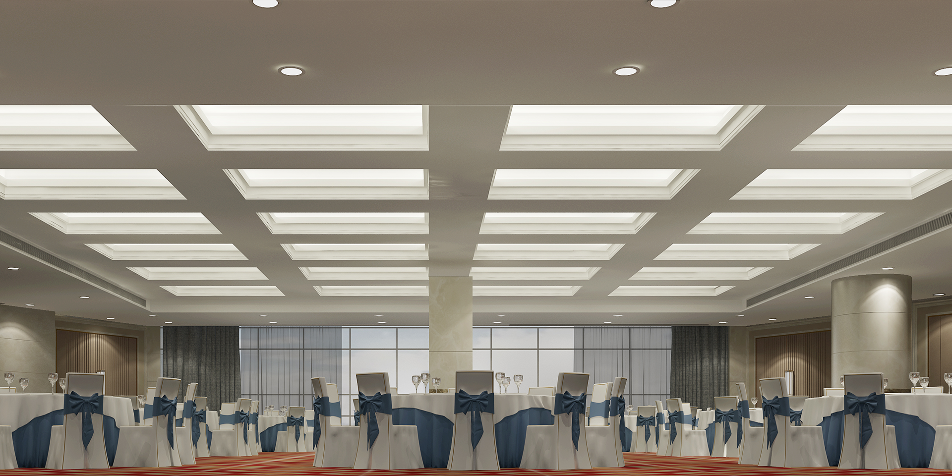 本案设计整体商务简约,体现出酒店该有的气场与格调。设计装修布局灵活,在灯光选择上设置多种照明,在满足正常用餐基本照明需求的同时还在舞台灯光上做了特殊设计,在多媒体设备上充分考虑多功能使用的可能性,满足商务宴会、商务会议、婚礼等多场景需求。