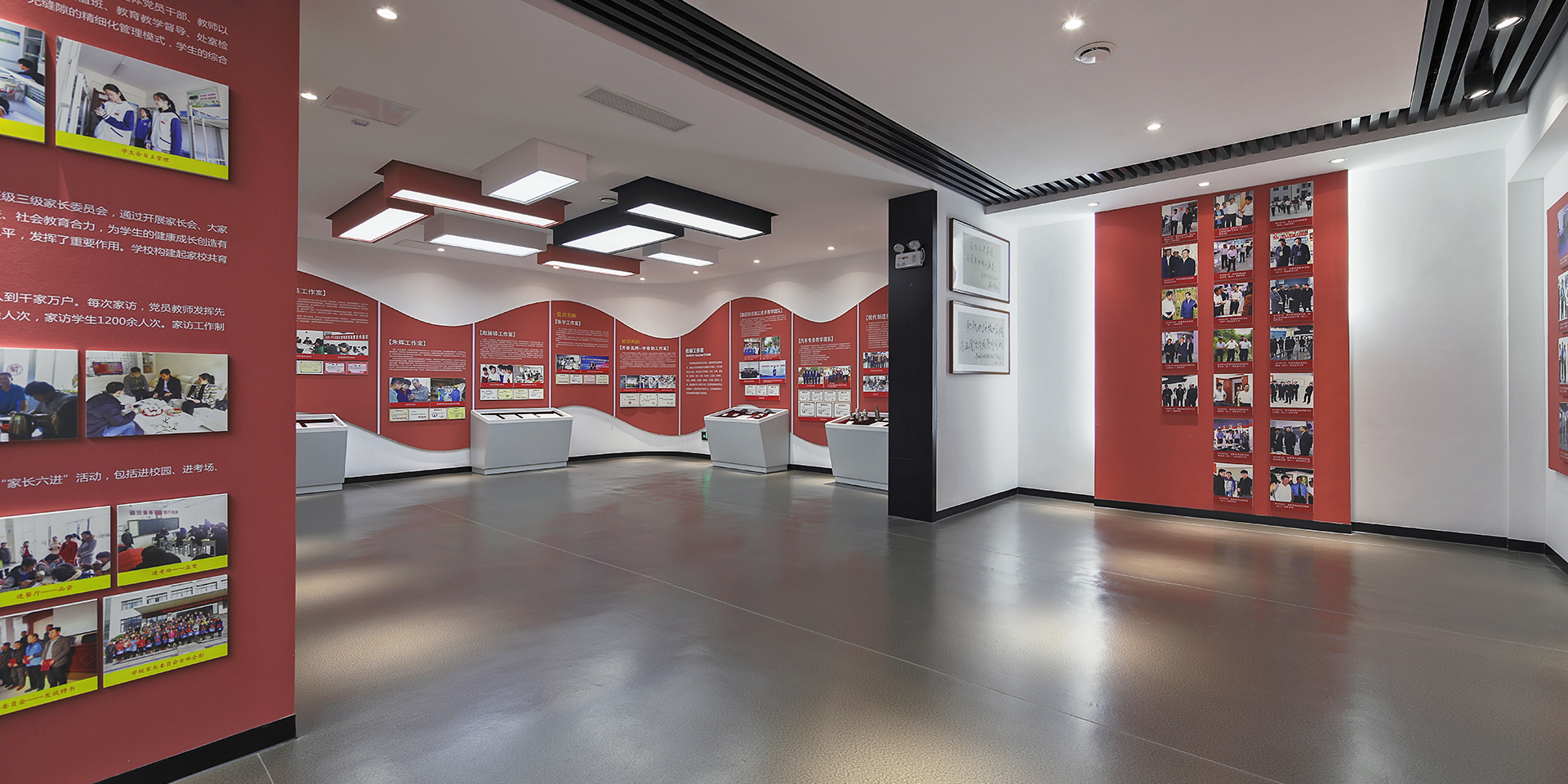 在深入了解学校的办学宗旨、校风校训和校园文化后,校史馆的设计概打破通俗的陈列室的布局,通过亮丽的主题色强化重点,加强视觉体验感,并通过灯光和多媒体技术让展示效果更立体生动打造出具有前瞻性、艺术性、科技性和富有层次感的布展风格。