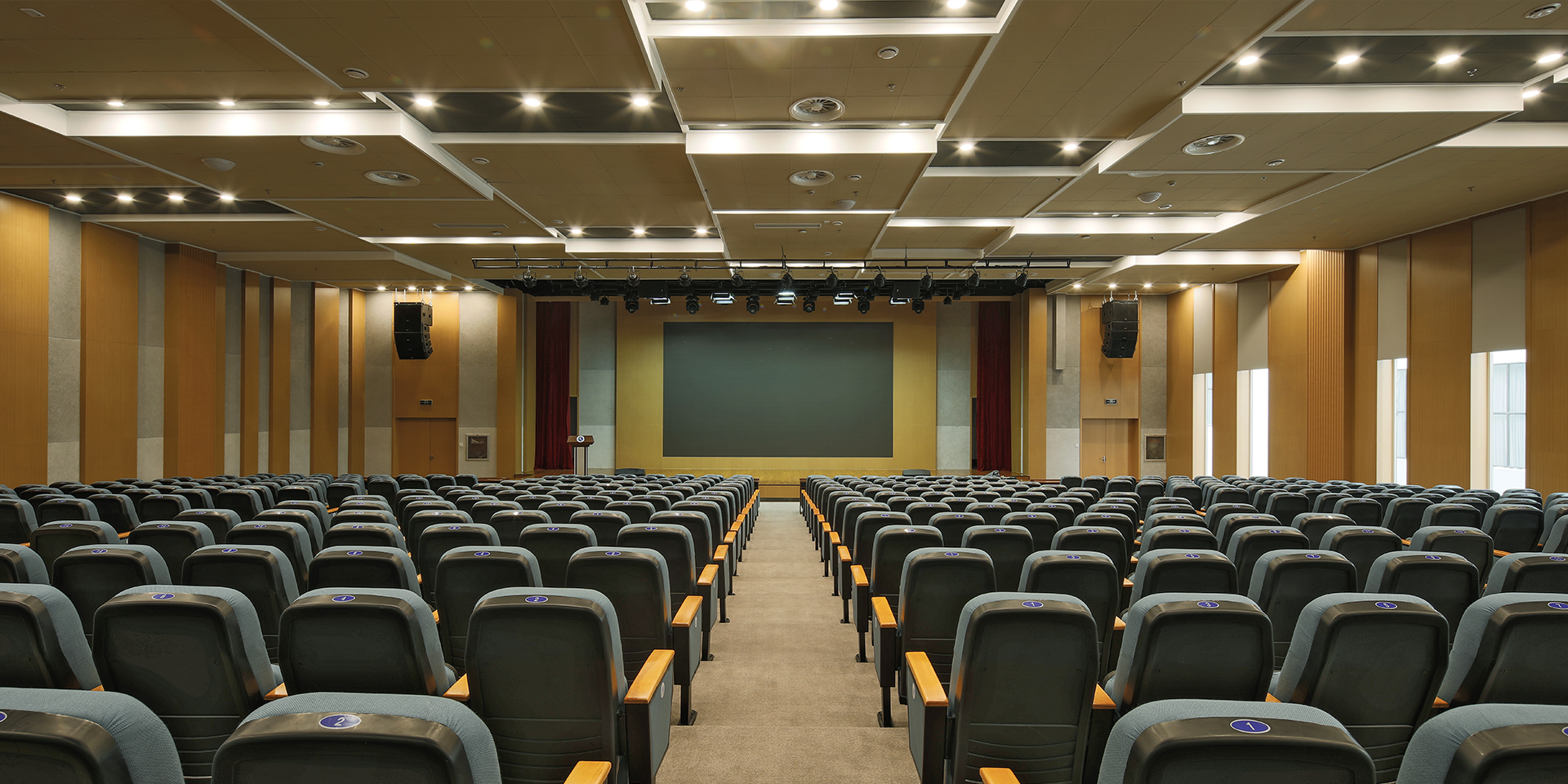 学术报告厅以实用、庄重、大气为主要设计理念,并根据原有建筑机构采用阶梯式设计方案,在顶面装饰预留出足够高度,并通过筒灯的分布人为将顶部分为若干部分实现区域局部照明,并充分考虑采光、隔音等诉求,在功能上满足学术报告、表彰会议、多媒体教学等多方面需求。