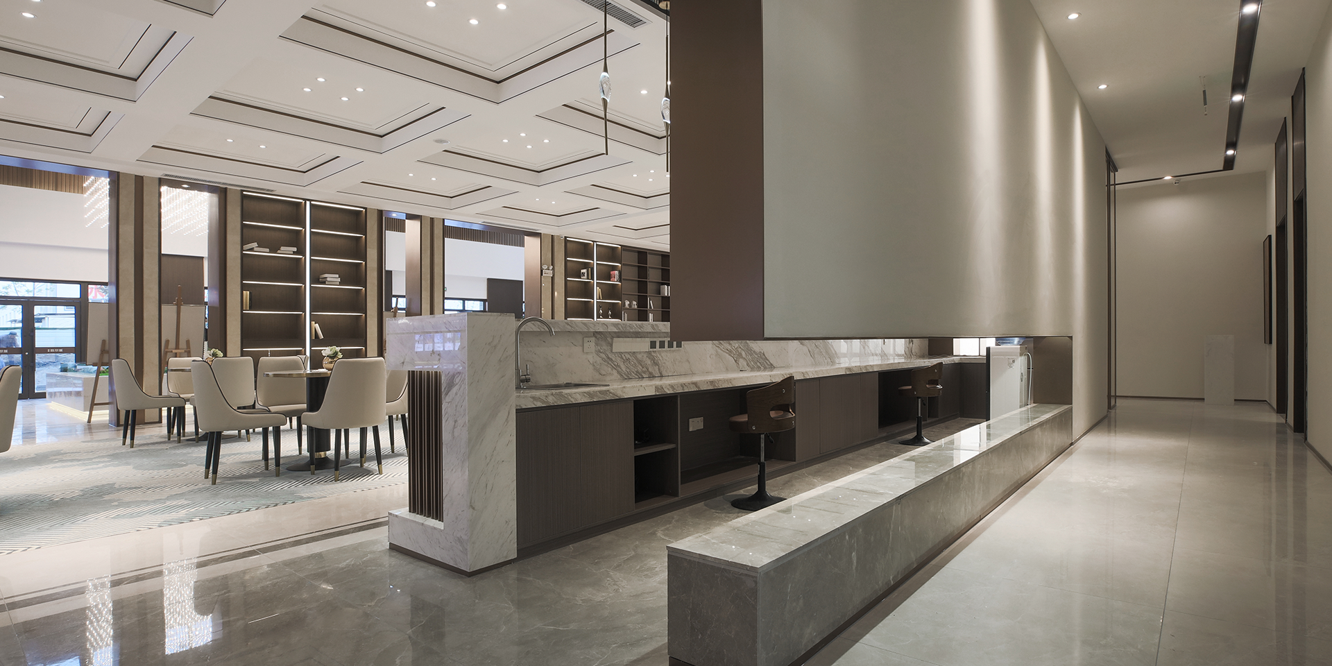 整体设计为凸显明亮、简洁、大气,前台颜色选用大理石材料,颜色偏向暖色调,沙盘作为中心,大小规模适当,在灯光选了大型现代风格灯具,共同塑造出年轻、有活力的品牌形象,符合其年轻人的购房者画像。